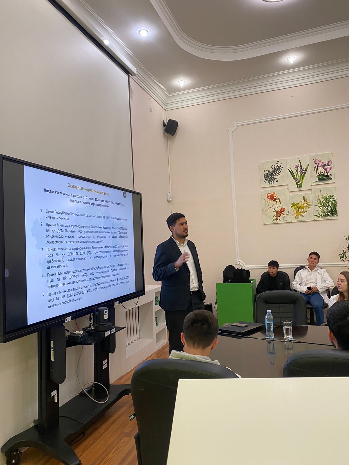 Директор компании «GxP Company» Өмірзақ Манас провел мастер-класс в зале «Фитотека» для студентов 2 курса «Технология фармацевтического производства» 10.10.2022 с 10.00 до 12.00 во время учебной практики.