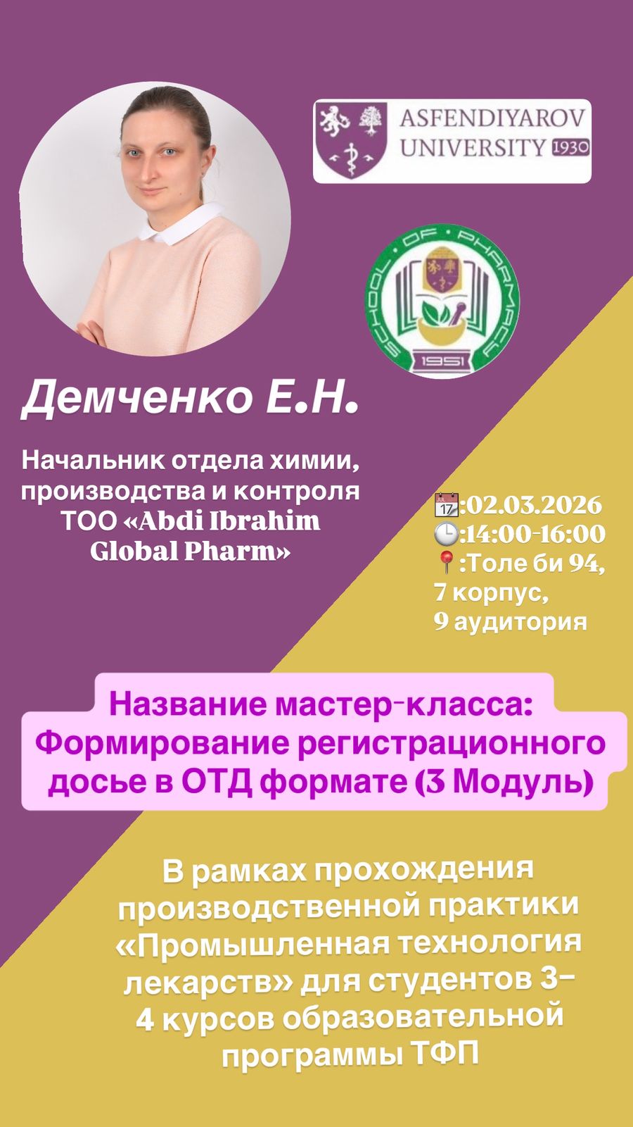 Мастер-класс проводит: Демченко Е.Н. — начальник отдела химии, производства и контроля ТОО «Abdi Ibrahim Global Pharm»