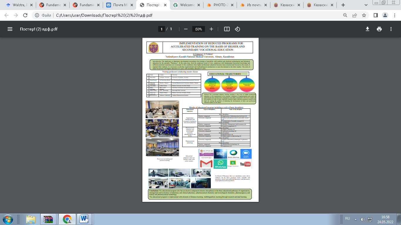 «2022 EAFP Conference- ‘Towards Pharmacy 5.0 Education» под организацией «European Association of Faculties of Pharmacy» (далее EAFP) где принимала участие с постерным докладом заведующая кафедры фармацевтической технологии Устенова Гульбарам Омаргазиевна, тема доклада «IMPLEMENTATION OF REDUCED PROGRAMS FOR ACCELERATED TRAINING ON THE BASIS OF HIGHER AND SECONDARY VOCATIONAL EDUCATION»