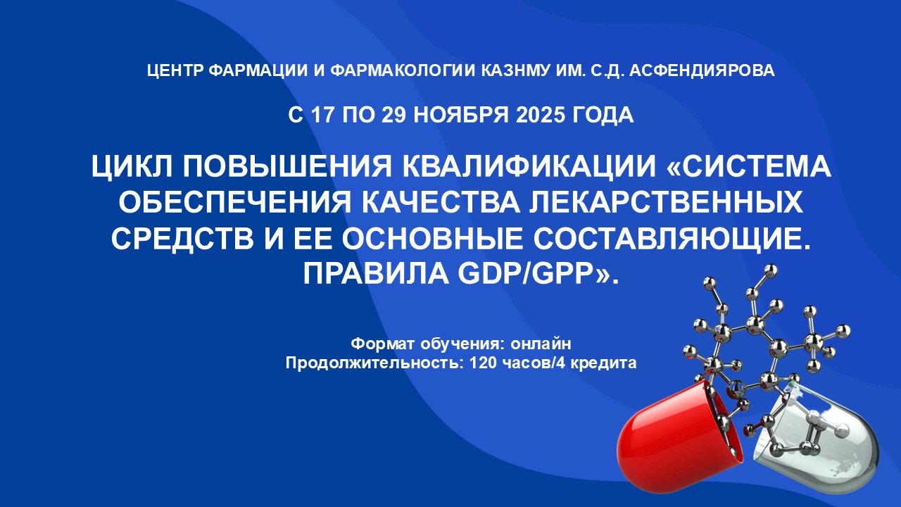 The Centre for Pharmacy and Pharmacology at S.D. Asfendiyarov KazNMU invites pharmaceutical industry specialists to attend a professional development course entitled ‘The Drug Quality Assurance System and Its Main Components. GDP/GPR Rules’.