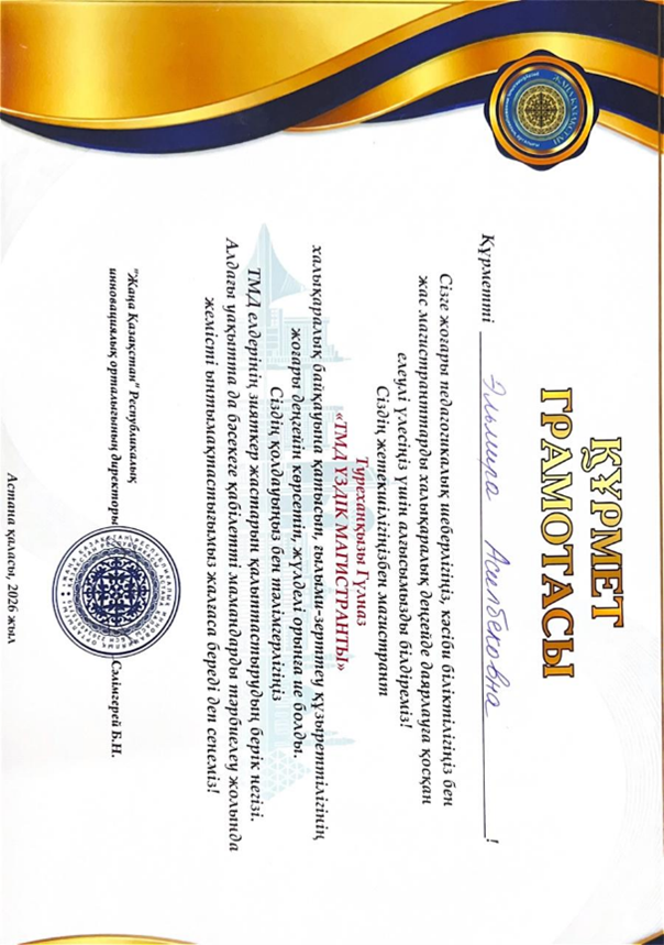 Туреханқызы Гүлназ жоғары жетістігімен шын жүректен құттықтай отырып, алдағы ғылыми қызметіне шығармашылық табыс, тың идеялар мен жаңа жетістіктер тілейміз! Университетіміздің абыройын асқақтатып, ғылым жолында биік белестерді бағындыра беретініне сенім білдіреміз.