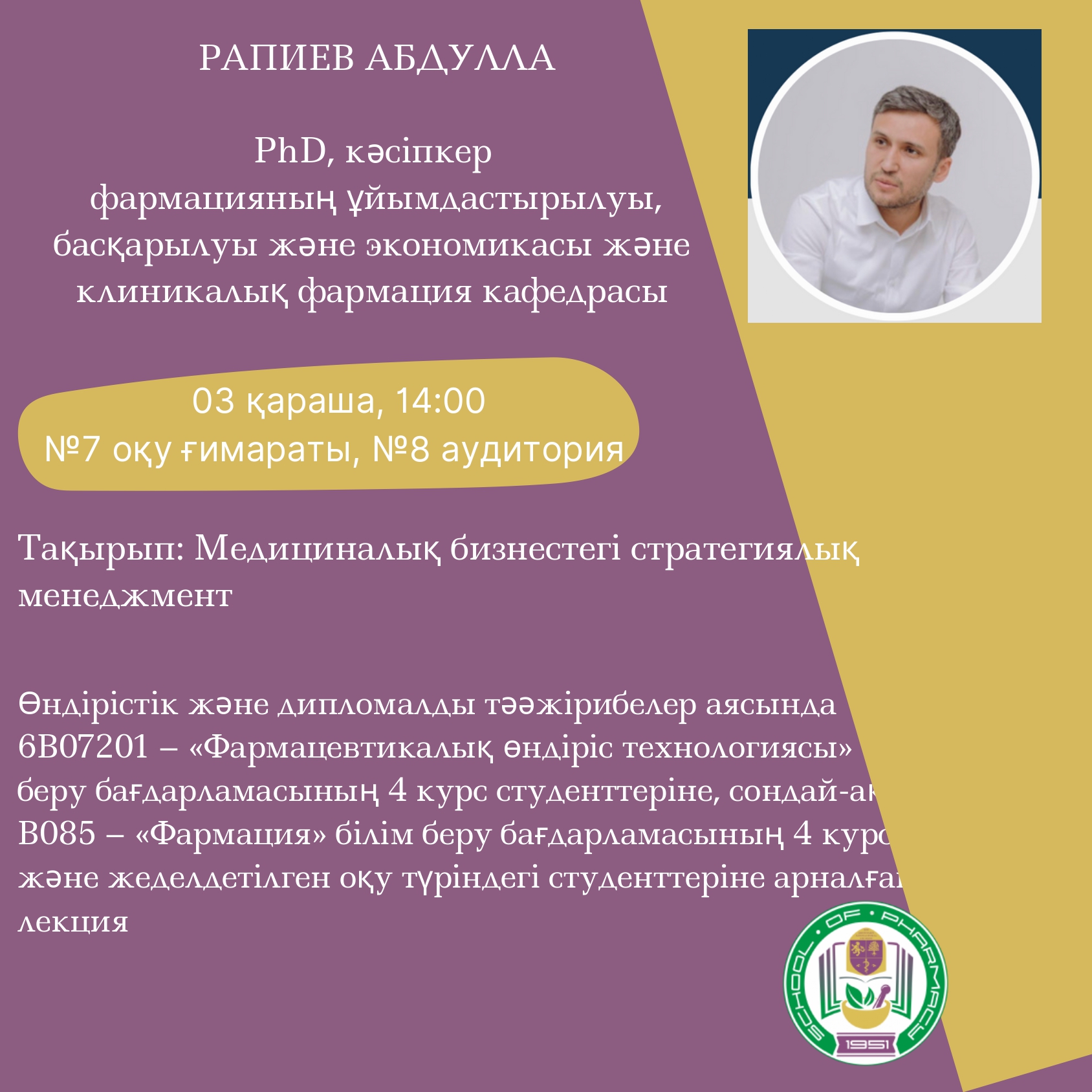 6В07201 – «Фармацевтикалық өндіріс технологиясы» және В085 – «Фармация» білім беру бағдарламаларының 4-курс студенттеріне арналған диплом алдындағы және өндірістік тәжірибе аясында өтетін мастер-класстар мен дәрістер туралы хабарлаймыз.