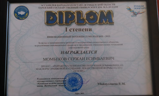 Осы конкурстан «инженерлік пәндер» кафедрасының оқытушысы Момбеков Сержан Есимбаевич «Разработка технологии получения помиферина из Маклюры оранжевой и создание лекарственной формы на его основе» атты жобасымен I дәрежелі дипломымен марапатталды.