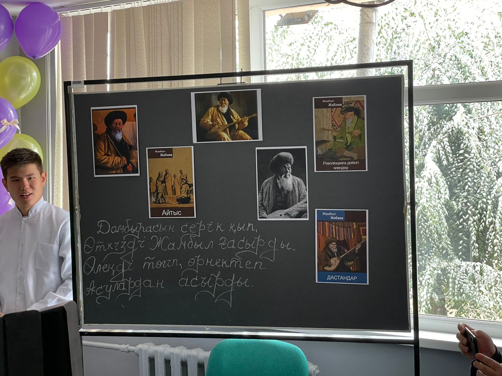 Тәрбие сағаты барысында Жамбыл атамыздың өмірі, шығармашылығы және ерліктері туралы баяндалып, өлең-жырлар арналды.