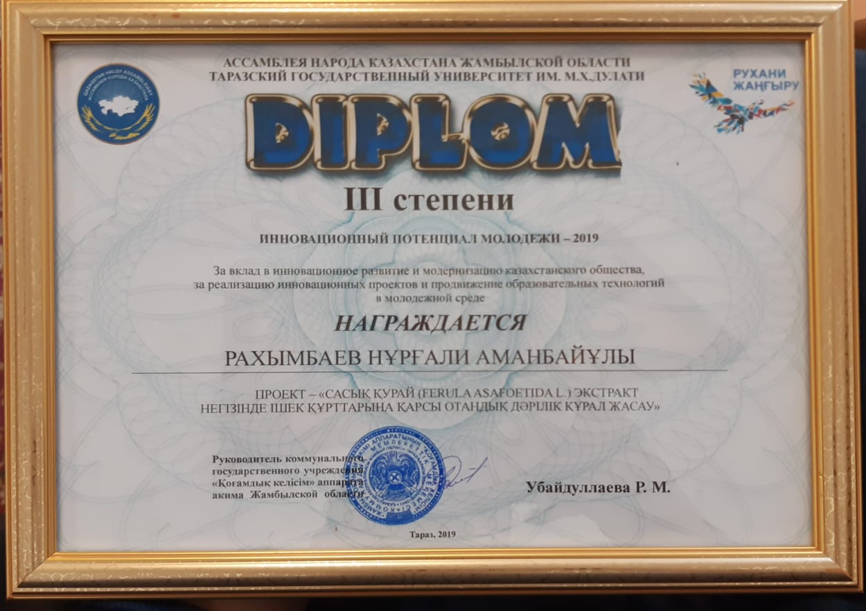 Фармацияның ұйымдастырылуы, басқарылуы және экономикасы және клиникалық фармация кафедрасының ассистенті Рахымбаев Нұрғали Аманбайұлы «Сасық қурай (Ferula asafoetida L.) экстракт негізінде ішек құрттарына қарсы отандық дәрілік құрал жасау» атты жобасымен III дәрежелі дипломмен марапатталды.
