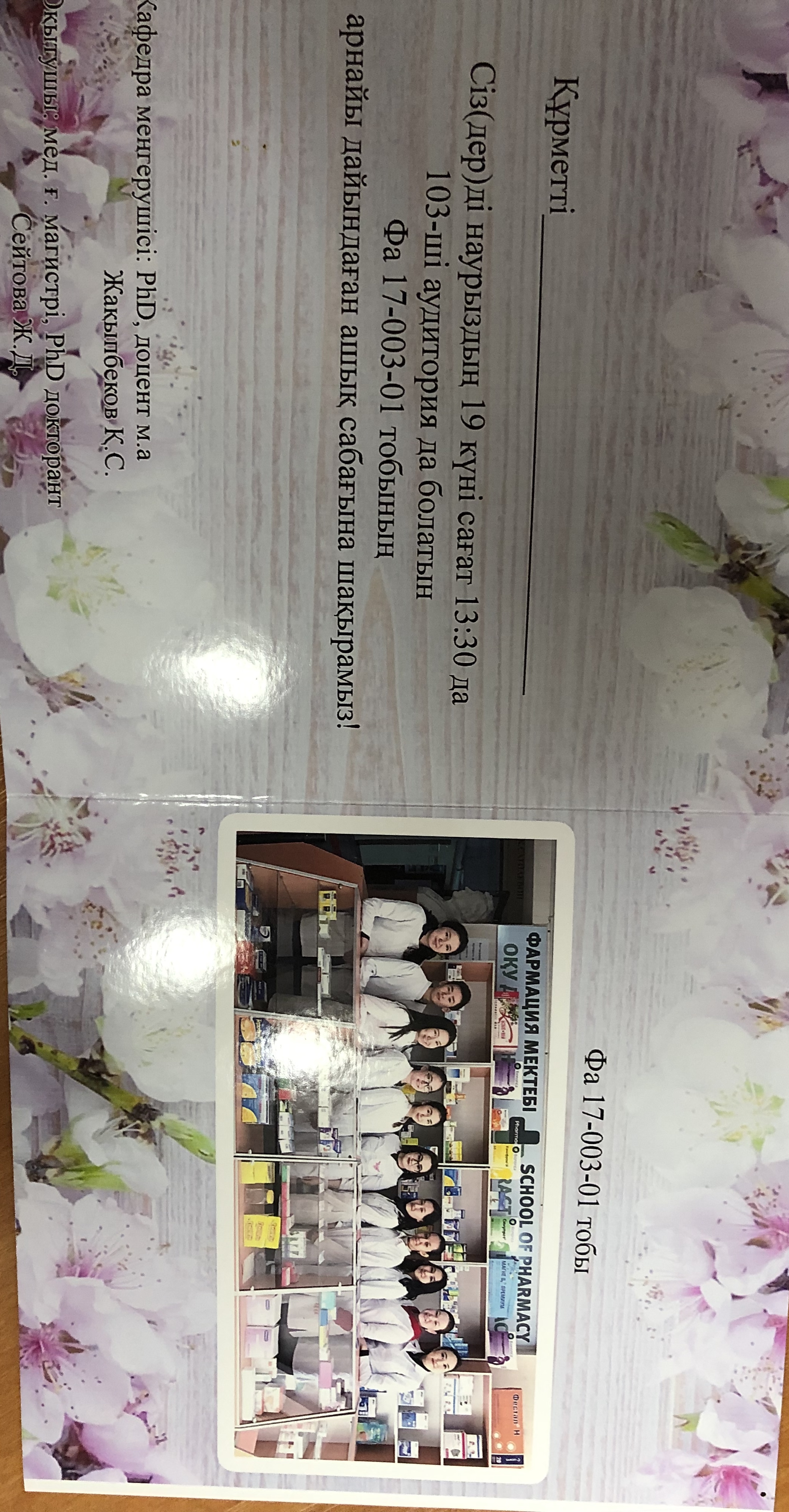 Фармацияның ұйымдастырылуы, басқарылуы және экономикасы және клиникалық фармация кафедрасында 19.03.2019 күні 103 аудиторияда кафедра мұғалімі Ж.Д. Сейтованың жетекшілігімен «Фармация» мамандығы бойынша 2 курс ФА 17 – 003 – 01 топ студенттерімен «Фармацевтикалық қамқорлық» пәні бойынша ашық сабақ өткізілді. Практикалық сабақтың тақырыптары: «Вирусты аурулар кезіндегі фармацевтикалық қамқорлық (ұшық)».